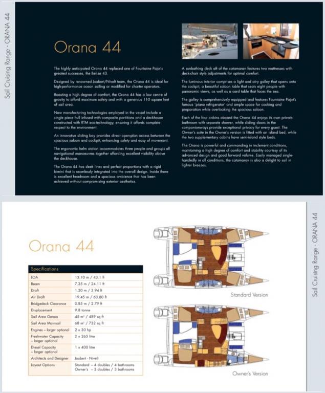 Here's a brochure that also contains specs (page 9 or 16) on the Orana 44 specs. Beautiful boat.