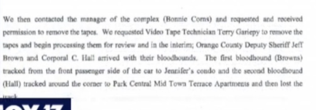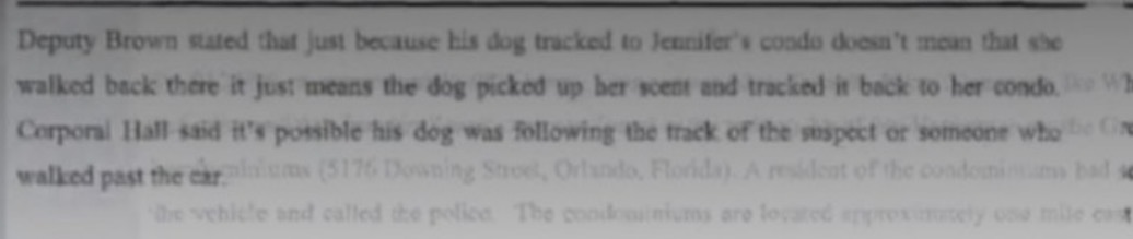 This is what the handler said in the police report. The dog that went back to Mosaic started on the passenger side. The handler thinks the dog was onto Jennifer’s scent and stated she didn’t have to walk the path for the dog to return to her condo.