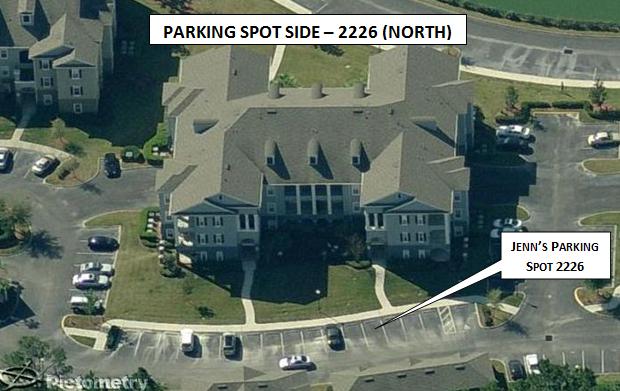 I have searched for confirmation of the answers to both these questions--in fact still search--and I can't really find anything solid. There just seems to be an assumption that since she definitely had a designated spot (back/north side) that is where she must have parked; although, there is parking--albeit what I call parallel parking--available on the front side (pond/south side) of her building. There seems to be no answers as to whether or not she could have used them if she wanted to.