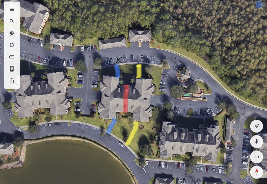 Another view of her apartment building. The path to the 14 apartments on Jennifer’s side is highlighted in blue, and the path to the 14 apartments on the other side is highlighted in yellow. Her parking spot has a black x. The red x is the location of her parents in the pic below.