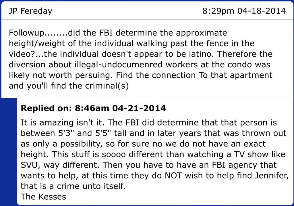 IMO, the maintenance worker, RE, aka "Chino," most likely abducted, raped, and killed Jennifer—probably alone but possibly with his supervisor, who seems very sketchy to me—but one problem with prosecuting him is the existence of other possible suspects. Jennifer had a creepy co-worker who was apparently obsessed with her, and she had an ex-boyfriend who was drinking at a bar not far from her apartment on the night that she was last seen.