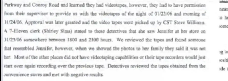 There was a clerk at 7-11 that claimed they saw her Monday night. The footage resembled Jennifer enough that they showed the family. The family denied it was her which doesn’t surprise me.