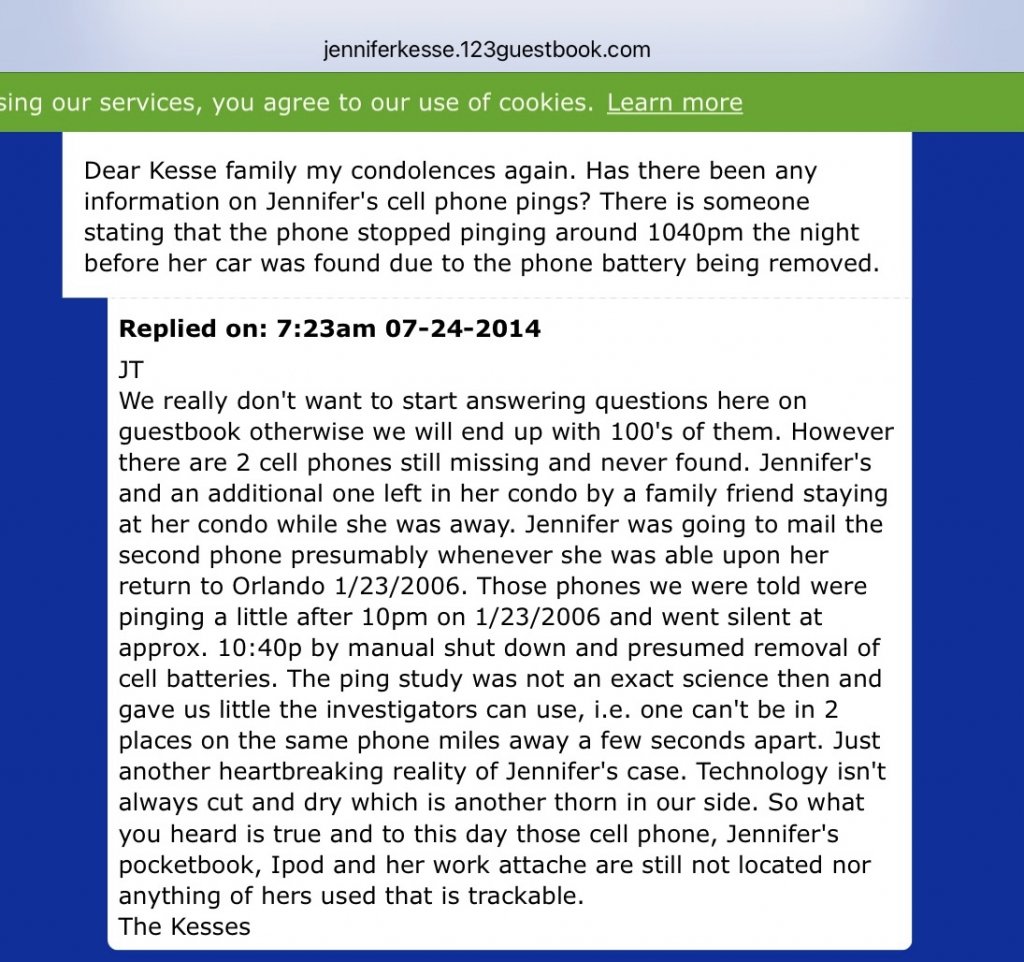 As far as the purse goes, who knows if Jennifer was really carrying one. Was anything inside the purse when they found it? Did Jennifer reach in her overnight bag and just get a few things so she wouldn’t have to lug a purse around all Monday night. I have a lot of friends that don’t carry purses at night. They just grab cash, keys, and cell phone. That purse‘s photo was put on their website in April 2008. He made a comment on the guest book in March of 2011 saying the purse wasn’t recovered. In September 14 there is a guestbook post saying they found it in her overnight bag. It’s all very strange, but they do have that purse in the photo and we don’t know what the missing one looks like. It’s just an assumption that one is missing from what I can tell.