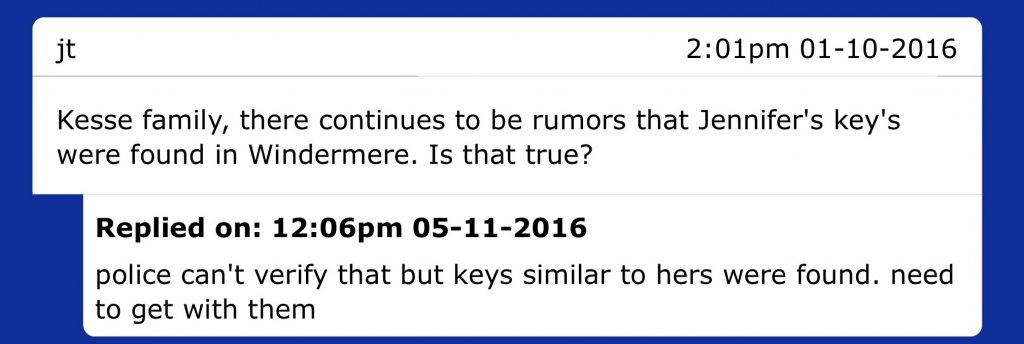 I’ve wondered if the keys were planted years later to send a message to someone. Keys were definitely found there. I don’t think they can determine if they’re Jennifer’s. I‘ve never understood why.