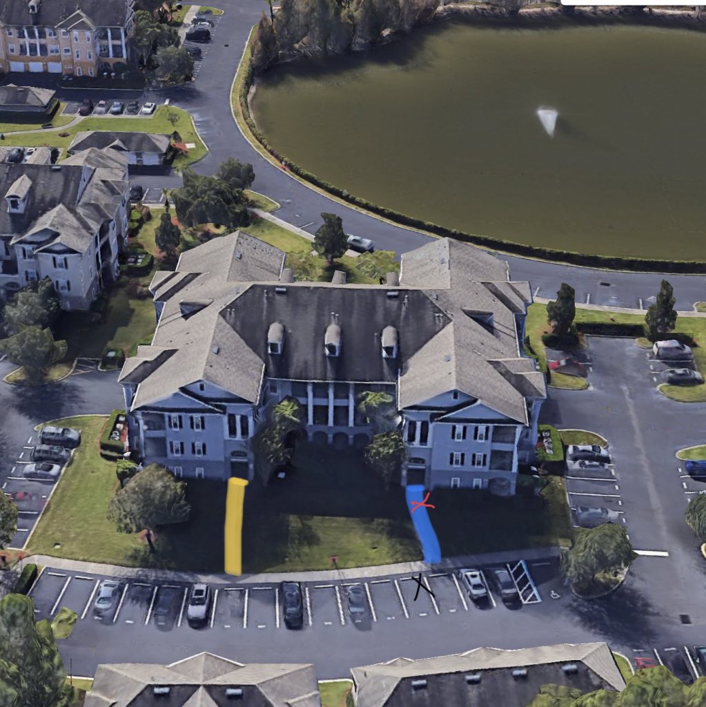 Another view of her apartment building. The path to the 14 apartments on Jennifer’s side is highlighted in blue, and the path to the 14 apartments on the other side is highlighted in yellow. Her parking spot has a black x. The red x is the location of her parents in the pic below.