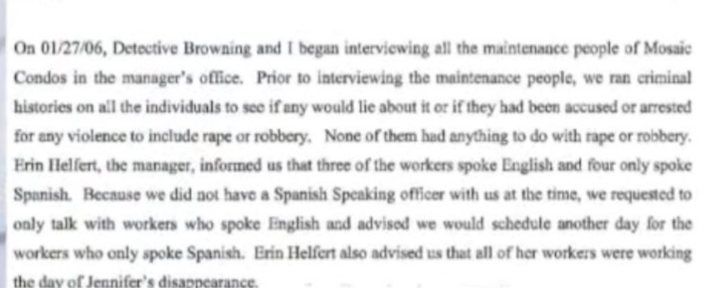 All this to say, is that whatever "investigation" took place early on, I think it was likely unwieldy. I can see about four o'clock in the afternoon, getting down to trying to interview some of the construction workers on site, and none of LE present spoke Spanish. They maybe needed to either bring someone in, or wait for hours or until the next day, etc. to get an interpreter. Over the next few days, opportunities to conduct interviews of everyone in and around the complex in an organized manner became less viable. I know they were able to interview some, but I have a feeling that during the afternoon of that first day, there just wasn't an interpreter available, and after that.... quite a few of those needing to be interviewed became "unavailable".