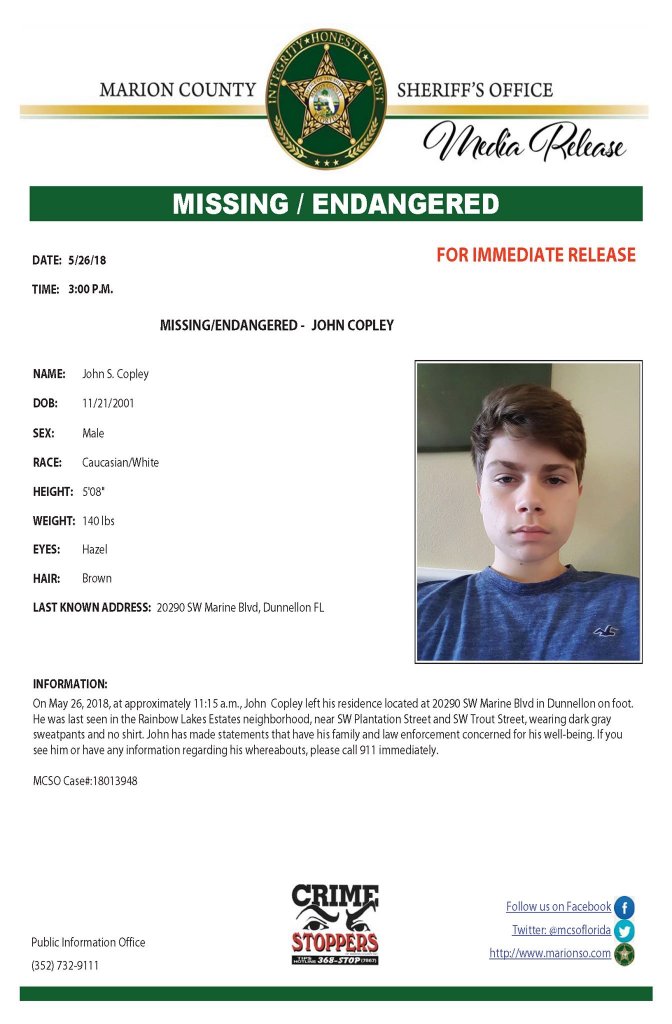 On May 26, 2018, at approximately 11:15 a.m., John Copley left his residence located at 20290 SW Marine Blvd in Dunnellon on foot. He was last seen in the Rainbow Lakes Estates neighborhood, near SW Plantation Street and SW Trout Street, wearing dark gray sweatpants and no shirt. John has made statements that have his family and law enforcement concerned for his well-being. If you see him or have any information regarding his whereabouts, please call 911 immediately.