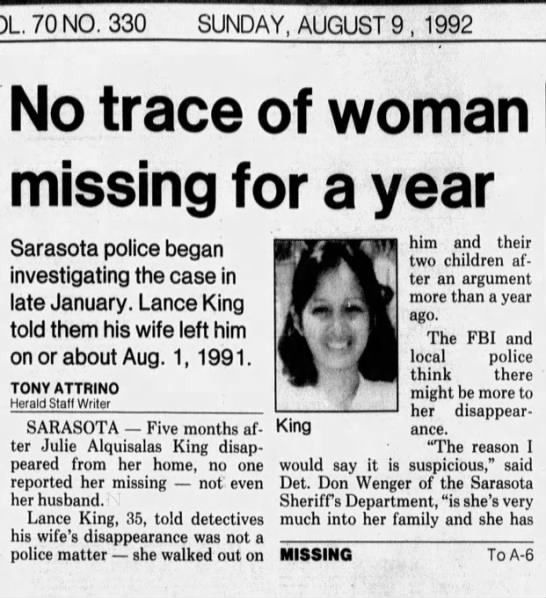 Her husband (Lance King) stated that he last saw Julie in August 1991, and that she just disappeared and he had not heard from her. He never reported her missing.