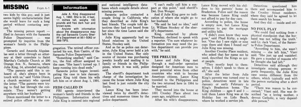 On February 27, 1992 the Sarasota County Sheriff’s Office was alerted to the disappearance of Julie King. Julie had moved to Sarasota from the Philippines and was reported missing by her parents who still resided overseas.