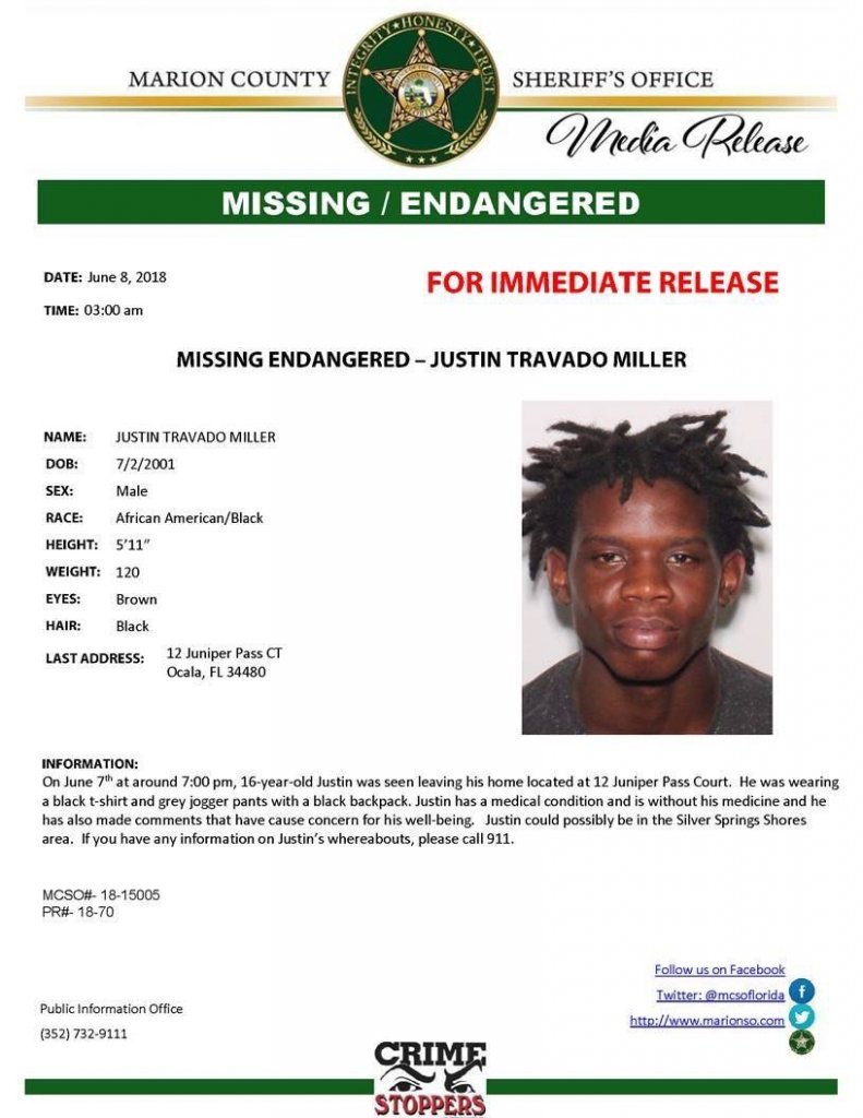 On June 7th at around 7:00 pm, 16-year-old Justin was seen leaving his home located at 12 Juniper Pass Court. He was wearing a black t-shirt and grey jogger pants with a black backpack. Justin has a medical condition and is without his medicine and he has also made comments that have cause concern for his well-being. Justin could possibly be in the Silver Springs Shores area. If you have any information on Justin’s whereabouts, please call 911.