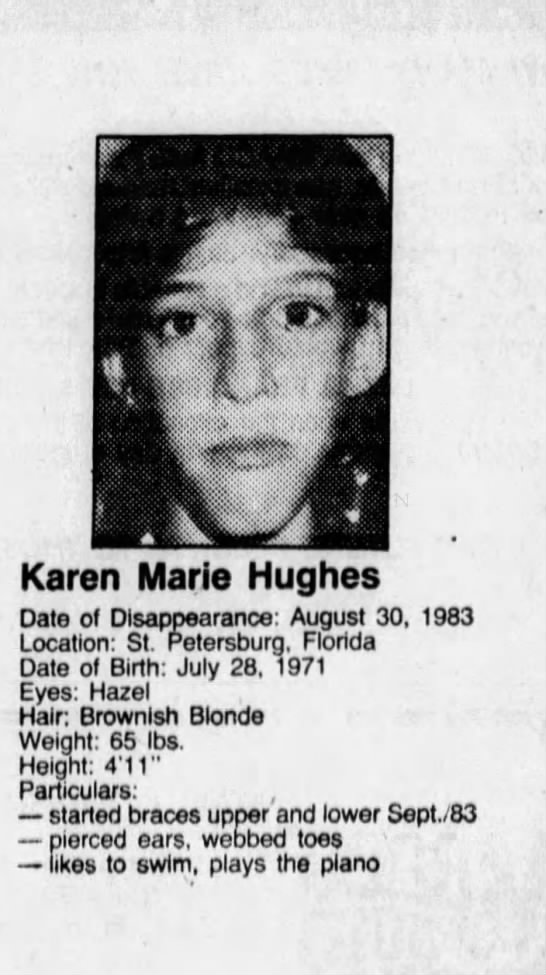 Karen was last seen in Albany, New York on August 8, 1983. Authorities believe she's with her non-custodial mother, Barbara Hughes. Barbara is Caucasian and was 40 years old in 1983. She may use the last names Brovillette, Kolkous and/or Martin. They may be in Florida, possibly the St. Petersburg area.