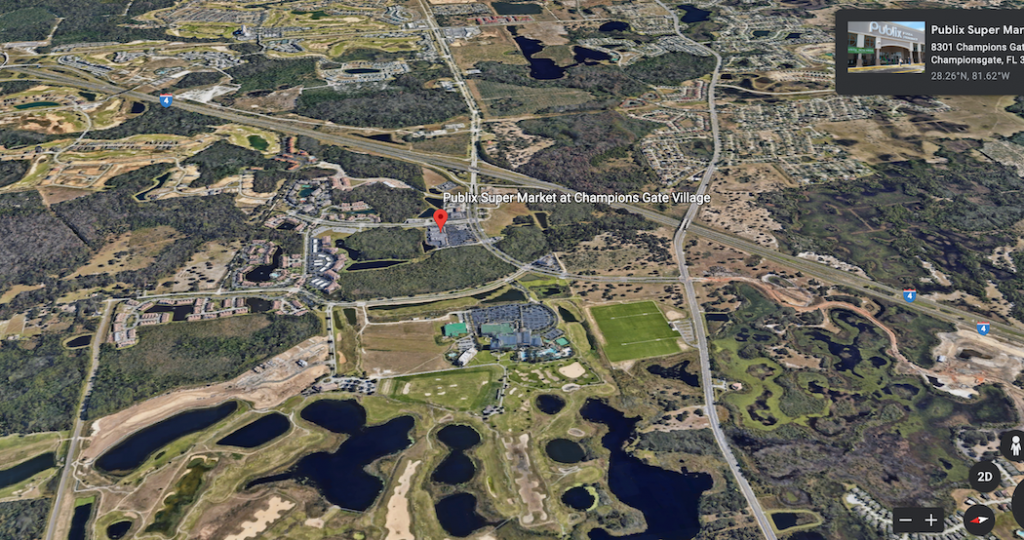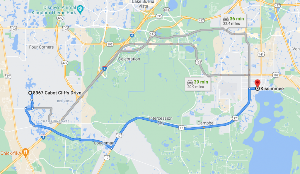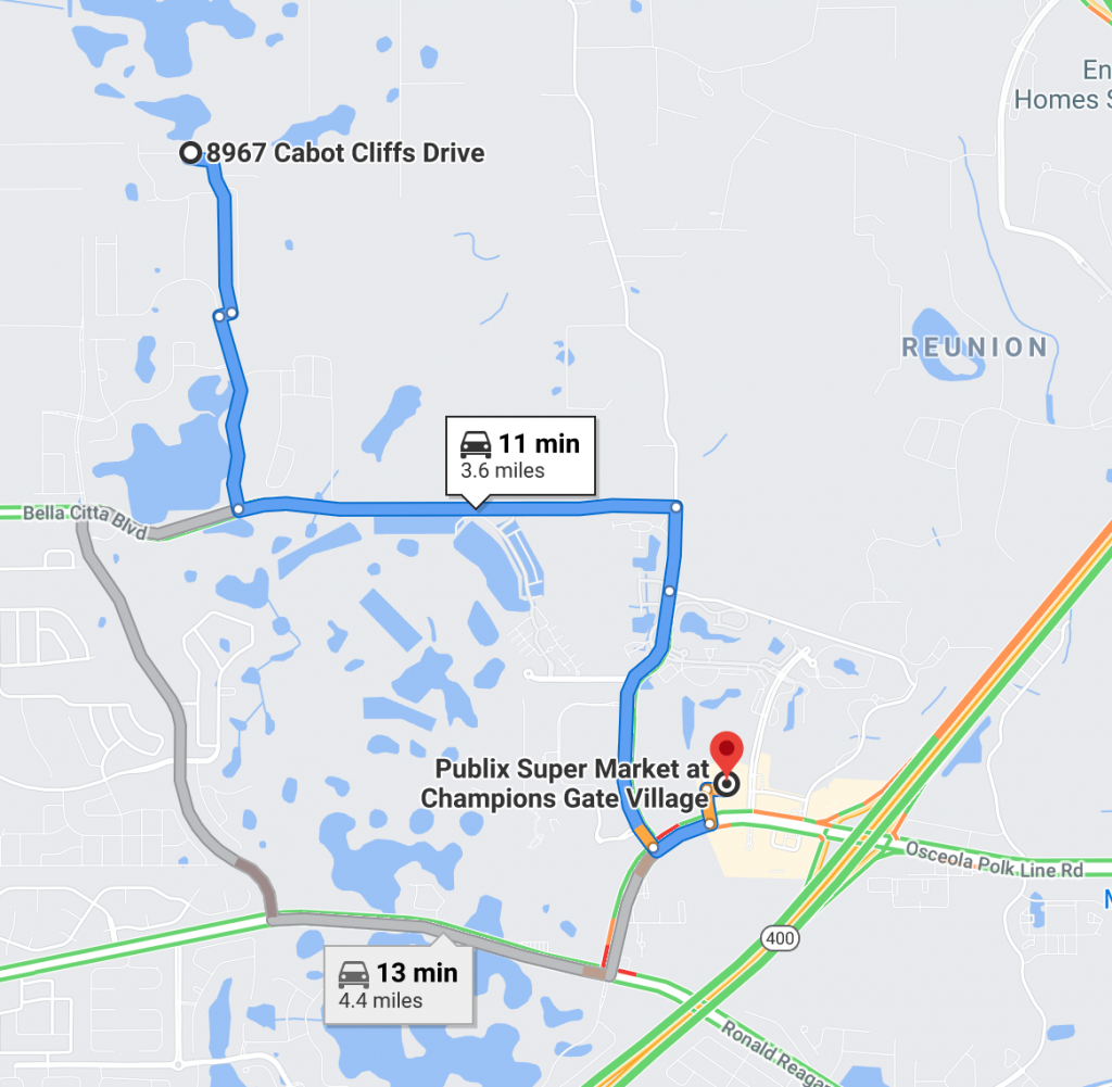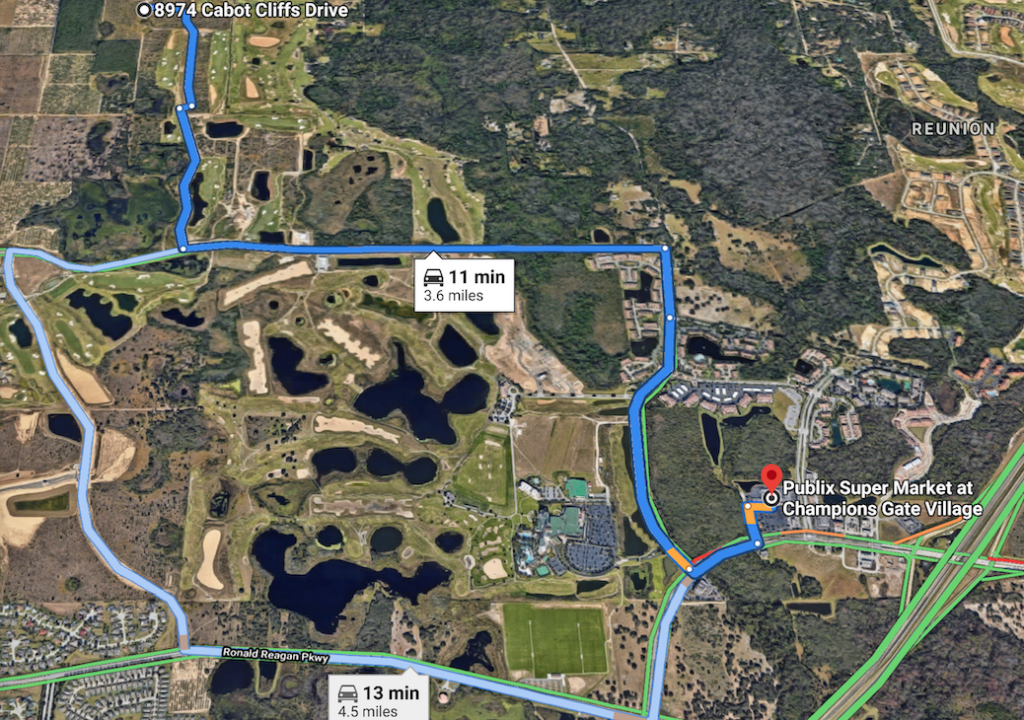 So if the Air BnB rental is on 8967 Cabots Cliff Drive in Four Corners FL and she was headed to the Publix at Champions Gate Village - here is the map: