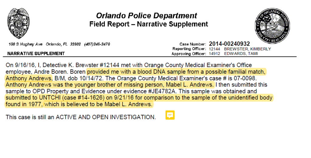 I do think the Orlando Jane Doe (1977) found in Lake Mann is quite possibly Mabel. Note the 2016 report that even LE uses the phrasing "which is believed to be Mabel L. Andrews."