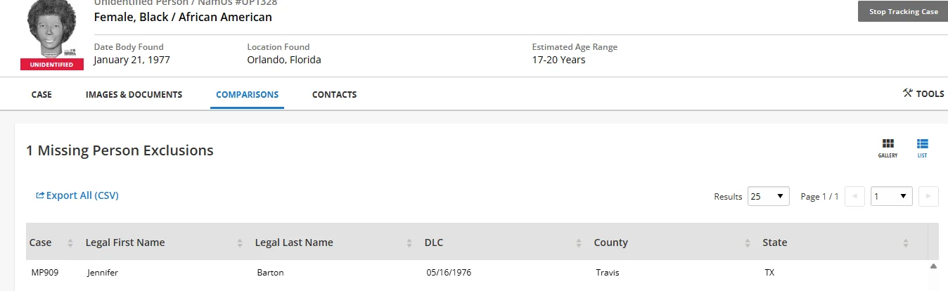 Thanks, I read the earlier posts. But she is not excluded on NamUs, which I would have expected if there isn't a match. Unless I'm missing something. The 10/19/2023 post says that the match has been ruled out on NamUs, but I didn't see the exclusion for UP1328. Hence my post above. As a side note, when I corresponded with the Doe Network, there was no mention of LE excluding UP1328 either.