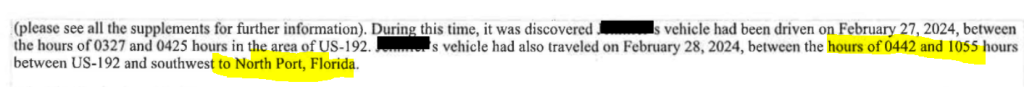 Here is the clip but I've also attached the page. It sound to me like the night of Feb 27th between 3:27am and 4:35am he was near US-192. The vehicle also traveled between 4:42am to 10:55am between US192 and North Port.