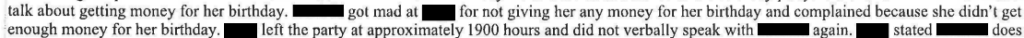 the bestie audio interview: she references all about the money issue and said Madeline was mad at her for not giving her a money present. best friend doesnt say anything about JS and a birthday present/or no birthday present, only that Madeline wasnt happy, didnt get alot. interview in entirety:What the interview said was she didn't get enough money, nor any money from a short redacted name. I've always thought that redaction was her mom, but it just dawned on me unless that redacted name is 'Jenn', it has to be someone else as that redaction is so short (~4 characters long). I supposed the BFF could have said 'Jenn', which is what the interviewer took down, but usually I've seen JS's name longer, meaning it would have been spelled out 'Jennifer'.