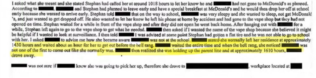 He currently lives in North Port, FL but comes to Kissimmee occasionally to spend time with Jennifer and Maddie. He arrived at their house on 2/25/2024 at about 8:45 PM. When he arrived, Jennifer was still at work and he directed Madeline to get ready for bed (which consisted of taking a shower). When Jennifer came home, she told Stephan she wanted to sleep in and told him to sleep upstairs with Maddie. Stephan woke up the next morning between 7:00 - 7:15 AM to get an “early start” and grab food at McDonald’s before school. He and Madeline left the house between 7:30 - 7:45 AM and headed towards McDonald’s at 14001 Town Loop Blvd. On the drive there, Madeline slept the whole time and said she didn’t want anything from McDonald’s when they arrived. He then drove past McDonald’s towards the school and dropped Maddie off on the right side of the road, near the community south of the State Road 417 Overpass between 8:20 - 8:40 AM. According to Stephan, Maddie was going through a phase, was embarrassed by his vehicle, and didn’t like to be dropped off at the school in it. Maddie told Stephan she was going to hang out with her friends. Stephan watched in the rearview mirror as Madeline rummaged through her backpack as she walked in the direction of the school. He assumed she was looking for her headphones but later realized she’d left her phone at home. When presented with a map, he advised detectives that he dropped her off at the intersection of Lilac Cove Lane and Town Loop Blvd. He said it was maybe the 5th or 6th time he’d dropped her off and it was common for MS to ask to be dropped off near the school. He said Maddie enjoyed the cold weather and was wearing a hoodie when he dropped her off. When asked if he’d made a U-turn at any point, he said he made a U-turn at the church parking lot to “try to sell her on McDonald’s one more time” because he was still hungry. When asked to show him on the map, he said he was bad at reading maps and said he usually takes John Young Parkway. He explained that he uses landmarks because he doesn’t know street names. When asked if Jennifer was home when he returned home (prior to his trip back out to the vape shop), he said he thought so but then said he wasn’t sure because Jennifer had a blood appointment at some point during the day. He apologized and said “sorry, everything is a blur”. He then said he believed JS was home because she was trying to sleep in as much as she could because she was “messed up” with her work schedule.