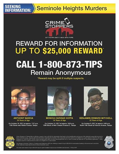 Crime Stoppers of Tampa Bay along with Bureau of Alcohol, Tobacco, Firearms and Explosives Partner to Offer a $25,000 Reward for Information in the Recent Seminole Heights Murders (2017/10/20)