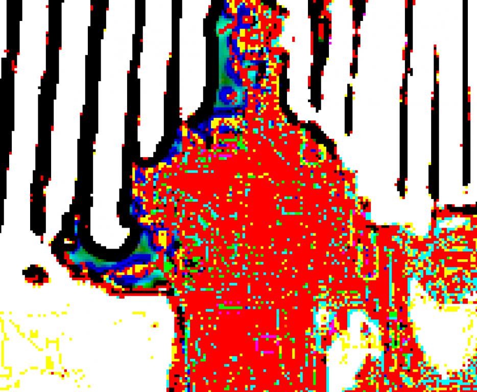 I've pixelated and filtered it to this point. It seems too small to be a smartphone, which seems much bigger when he's holding it in different security footage. The flip phone also seems to cast light on his arm, chest and face area, but who knows?