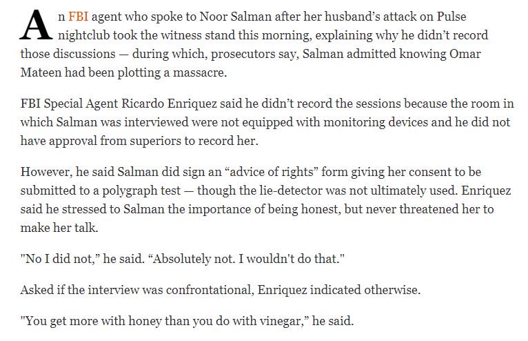 To recap, Salman said on June 8 she rode with Mateen as he drove around Pulse for 20 minutes with the windows down. But another FBI agent who didn't take her statement said cellphone data, restaurant receipts and footage of them at a Kissimme mosque disproved that.