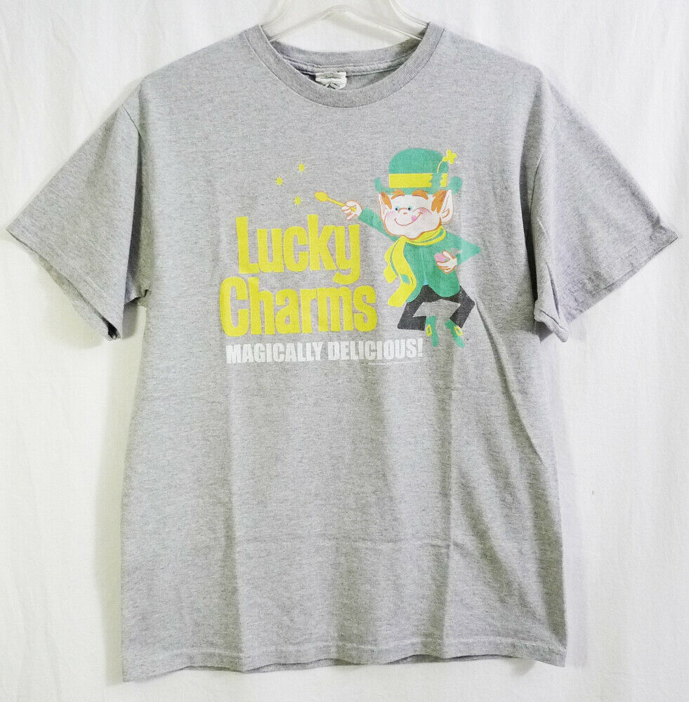 Gray T-shirt (short sleeved) with a picture of the Lucky Charms Elf. Wording says: "Lucky Charms Magically Delicious". Unknown Size.