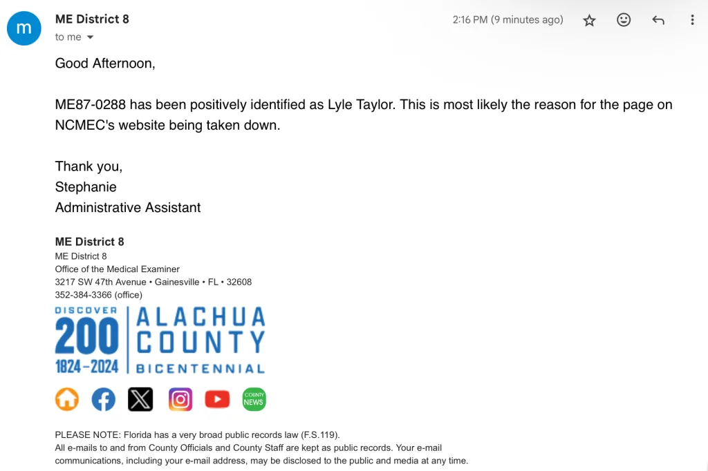 An email I sent to the District 8 medical examiner got this response today. I couldn’t find any missing people named Lyle Taylor though. I guess we’ll probably get a press conference or announcement soon. I think Othram’s done some work with the different Florida districts and I know they specialize in fire-damaged remains so maybe it was them.
