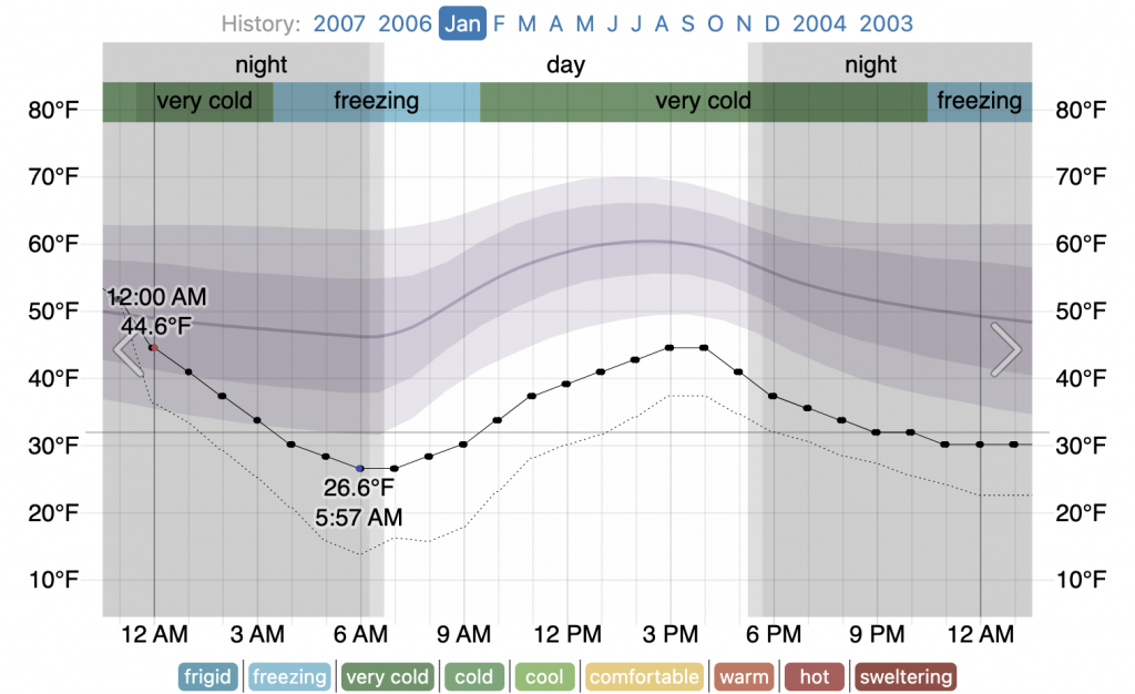 Measured temperature at approximately 2 meters above the surface of an open field (black dots) and 6, 12, and 24-hour lows (horizontal blue lines) and highs (red lines), placed above the hourly average temperature (faint purple line), with 25th to 75th and 10th to 90th percentile bands. The thin dotted line is the perceived temperature. Civil twilight and night are indicated by shaded overlays.