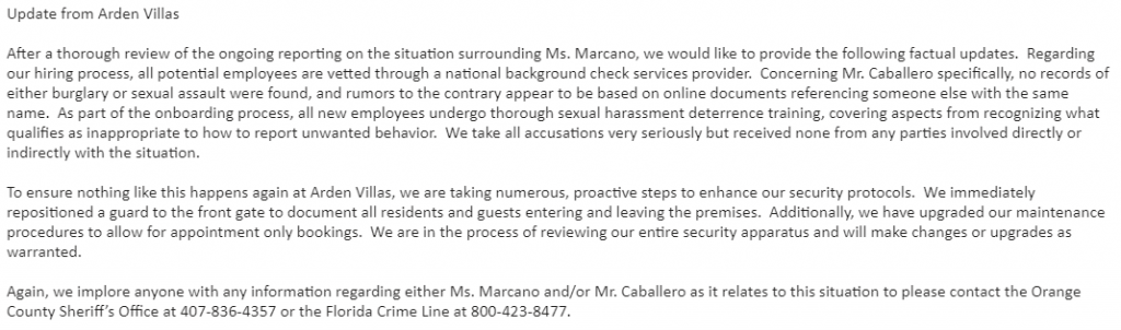 Miya Marcano’s aunt, Semone Westmaas, said she ran into Armando Caballero on Saturday. That is the same day that cell phone video was shot that appears to show him in an apartment complex parking lot. It was two days before he apparently killed himself.