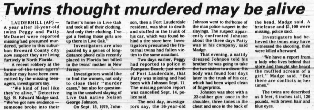[h=2]Circumstances of Disappearance[/h] Peggy disappeared with her twin sister Patty on September 15,1979 in Ft. Lauderdale, FL. They went to a Disco by the name "The Plank". A person they were known to be with was found deceased in the trunk of a car four days later. Neither Patty nor Peggy has been seen since.