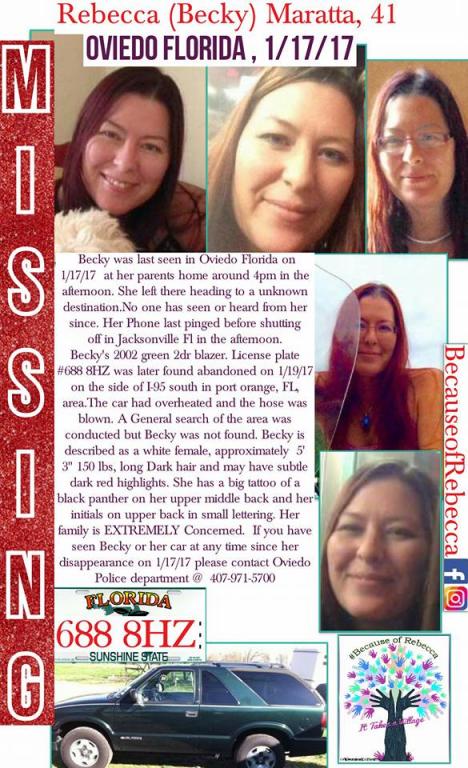 Rebecca Maratta, 41, was last seen Jan. 17 at her parents' home on West Rivera Boulevard. She left the home without telling anyone where she was going.