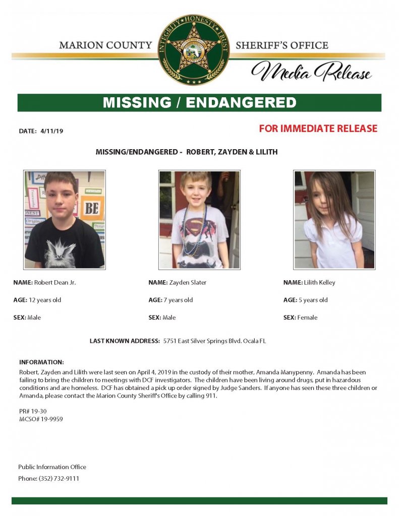 Robert, Zayden and Lilith were last seen on April 4, 2019 in the custody of their mother, Amanda Manypenny. Amanda has been failing to bring the children to meetings with DCF investigators. The children have been living around drugs, put in hazardous conditions and are homeless. DCF has obtained a pick up order signed by Judge Sanders. If anyone has seen these three children or Amanda, please contact the Marion County Sheriff's Office by calling 911.