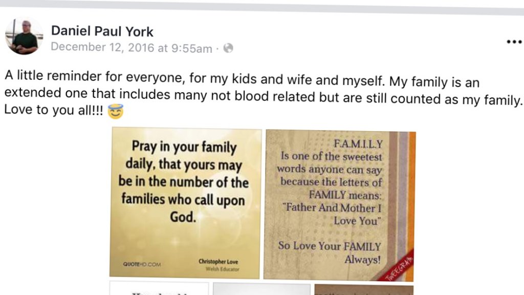 On Dec 8/16 he posted two photos from Little Caesar's Pizza in Jupiter FL. One was a close up of a pizza, the other was of the front counter, with an employee standing there. No other people in the photos and definitely no family. (He posted a review of that LC the next day on their FB page.)