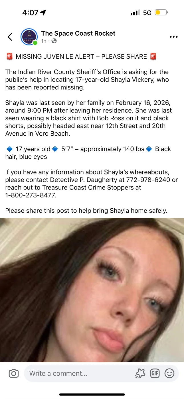 17 year old shayla vickery was reported missing by the indian river county sheriff’s office after last being seen by her family on feb 16 around 9pm