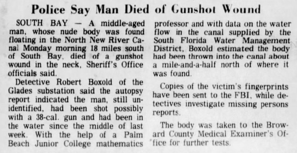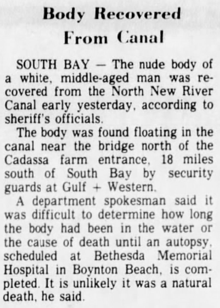 The decedent was found nude floating in the New River Canal, 17 miles south of South Bay, Palm Beach County, Florida