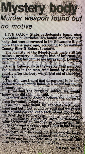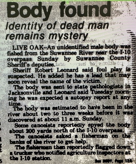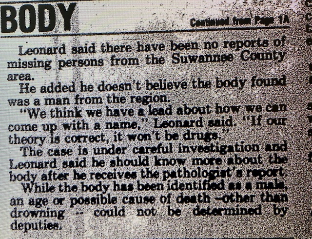 When I found that Suwannee County had an open case file involving a set of human remains in June 2021, I decided to dig into the Suwannee Democrat archives and look for this story. And I certainly did. Afterwards, I took notes and copies of the articles. Then I reported my findings to the Suwannee County Sheriff's Office. Sgt. Kelly was quick to return my messages.