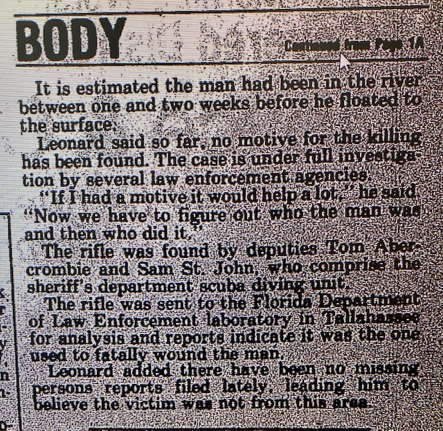 Sheriffs deputies Tommy Abercrombie and Sam St. John recovered the body and the body was sent to the Medical Examiner's Office in Jacksonville, Florida. Additionally, they recovered weapon, a .22 caliber rifle in the river and submitted it as evidence. The rifle was determined to be the weapon used to kill this man, as nine .22 caliber rounds were found in the man. His legs and one arm had been bound by rope, and a bag of sand was tied around his neck as a weight to sink him into the bottom of the river.