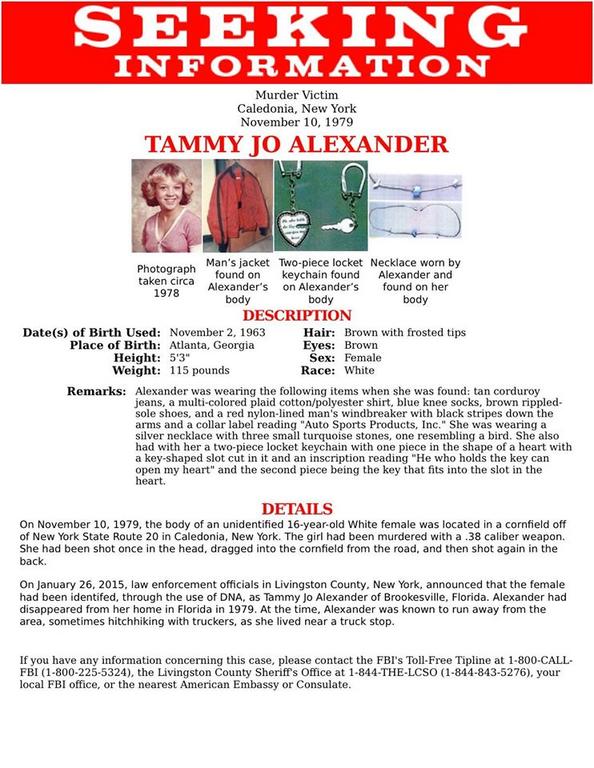 On January 26, 2015, law enforcement officials in Livingston County, New York, announced that the female had been identifed, through the use of DNA, as Tammy Jo Alexander of Brookesville, Florida. Alexander had disappeared from her home in Florida in 1979. At the time, Alexander was known to run away from the area, sometimes hitchhiking with truckers, as she lived near a truck stop.