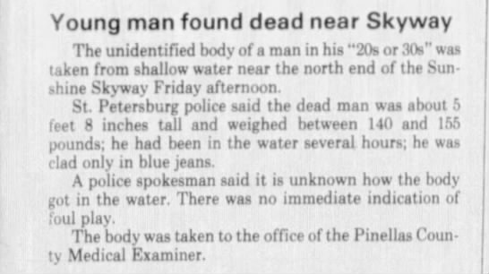 'Young Man Found Dead Near Skyway' - Tampa Bay Times, Oct 11th 1980.