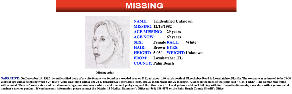 Hi all. I know this is a fairly dead post but this is the missing person poster and info for the Jane Doe whose remains were found in Loxahatchee. PBSO is in the process of making a video about this Jane Doe in their series called "The Nameless".