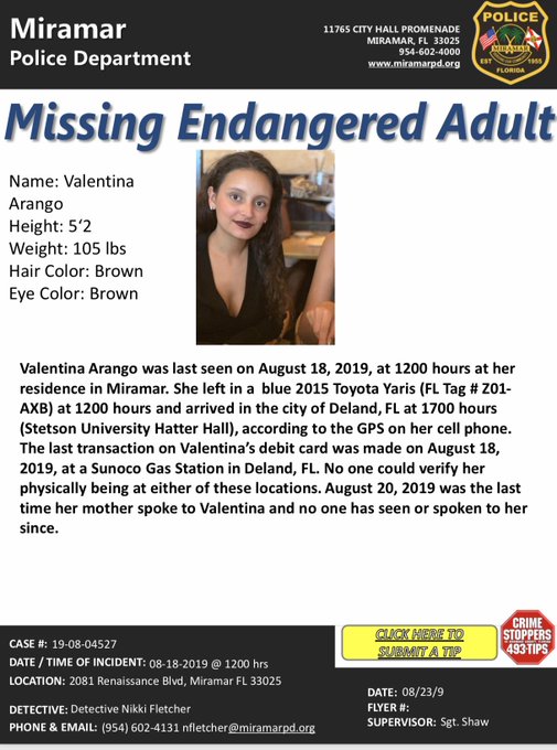 According to a police flyer, Valentina Arango left her home in a blue 2015 Toyota Yaris with Florida tag Z01-AXB and arrived at Stetson University's Hatter Hall in DeLand around 5 p.m., the GPS on her cellphone showed.