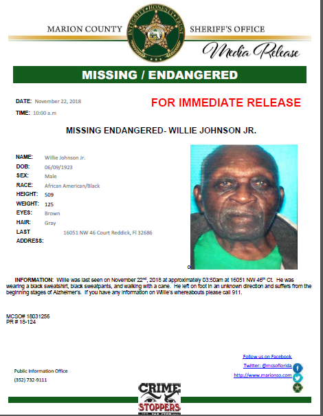 Willie was last seen on November 22nd, 2018 at approximately 03:50am at 16051 NW 46th Ct. He was wearing a black sweatshirt, black sweatpants, and walking with a cane. He left on foot in an unknown direction and suffers from the beginning stages of Alzheimer’s. If you have any information on Willie’s whereabouts please call 911.