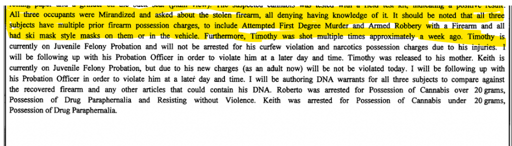 The weed that he had was minimal compared to the fact that he already had gun charges, and was on juvenile probation. He'd just turned 18 in June of 2021. They are already beyond just having some weed. The driver jumps and runs when taken out of the vehicle, someone threw a firearm out of the vehicle, a firearms was found to be stolen, and they all had prior firearm offenses. This guy and another in the vehicle were on Juvenile Felony Probation. One had been shot multiple times, just a week prior. It was only a matter of time.