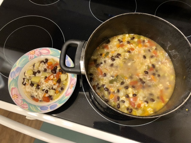 I brought that to a boil and added my soft veggies. About 1/4 cup each of zucchini, yellow squash, spinach and 1 Roma tomato, seeds removed and 1 spear of asparagus. I let that cook at a low boil for 20 minutes. Then I added 3/4 cup dry white rice. I cooked it until the rice was soft, maybe another 20 minutes. I added salt & pepper. Then added 1 can of drained and rinsed black beans.