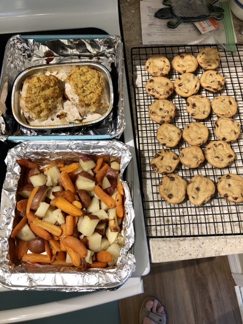 I was given lots of red potatoes and carrots so I roasted a pan of those. Nestle cookie dough was $2.49 at Publix. So I bought a package but only baked half of them. A well rounded meal that was very tasty. Tonight is leftovers.
