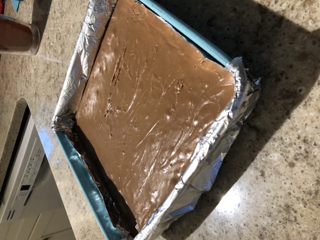 Now I have to wait hours for it to firm up. It called for a 9” x 13” pan. But I stuck it in my 10 x 10” pan instead. I cut the pieces really tiny anyway. I’ll pack it in small bags and pass out to kiddos & friends too.