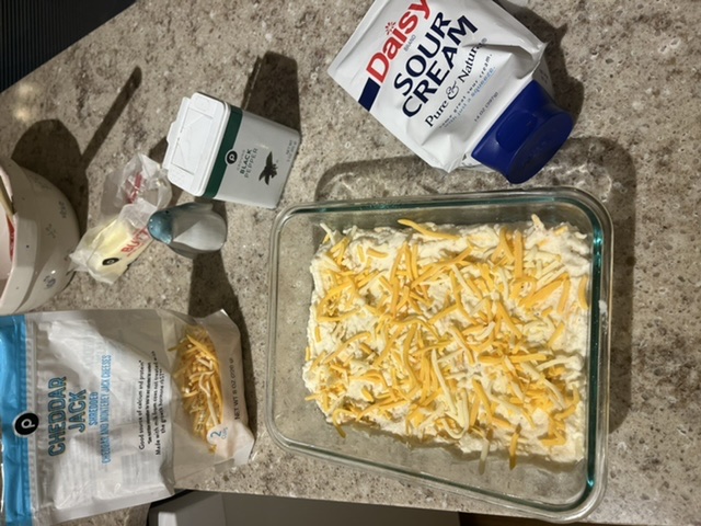 I started with ready made mashed potatoes and added 2 little pieces of butter, grated cheese, sour cream, salt and pepper. Spread it in the dish and sprinkled more cheese on top then baked it. The lima beans were in the crockpot with veggie broth, kosher salt, white pepper, onion & garlic powders and parsley.