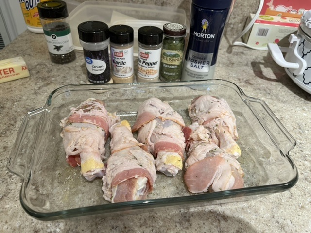 My oldest is visiting. Last night I made bacon covered drumsticks, twice baked potatoes and the lima beans in the crock pot for dinner last night. The chicken was at 375 deg for almost an hour and didn't look like it was done. It was and tasted fine but it gave us pause. Maybe I should have done it at 400 deg instead. The bacon wasn't crispy but it was fine.