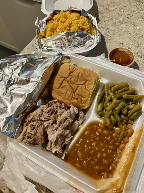 Since Hurricane/Tropical Storm Nicole was coming for a blow thru - I stopped at the "roach coach" that I will actually eat from. I figured since everything was shutting down, they'd want to get rid of their product. I bought a pulled pork meal with 3 sides for $15. I figured it would be 2 meals, maybe 3. Well the extra side is yellow rice and there must be 3 cups of yellow rice.