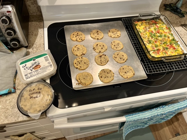 I woke up at 5am and couldn't go back to sleep. So I got up and made a breakfast casserole and a batch of gluten free cookie dough. I only baked one pan of cookies and put the rest in the freezer. My oldest left with a full tummy, some breakfast casserole, a sandwich, some cookies to snack on and cookie dough for her freezer.