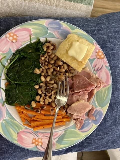We seasoned the canned black eyed peas, warmed up some ham that had been frozen, made GF cornbread, in addition to the spinach & carrots we made yesterday.